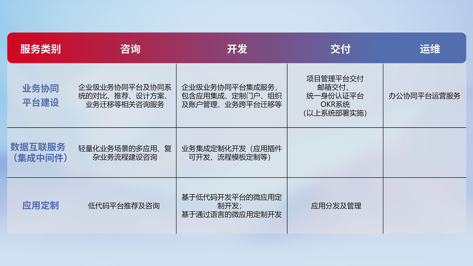 针对钉钉、、企微、、、、IDaas等平台级产品提供产品的规划、、、方案、、、交付、、、、定制化开发等服务,,,实现如统一协同办公、、智能客户服务、、混合会议管理、、智能数据查询、、、、等业务场景,,实现数字化转型。。