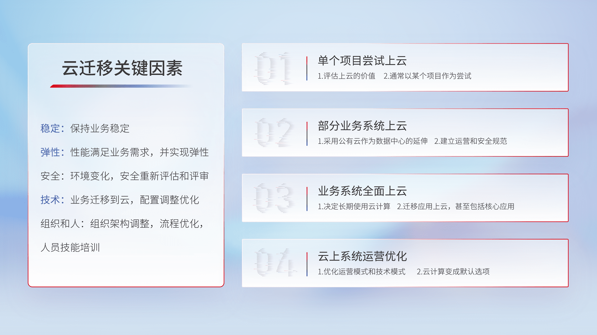 结合实际业务,,,,从规划设计、、、云平台选型、、云原生改造、、、、数据迁移、、、集成交付,,,迁移全过程为客户识别最佳上云路径,,做好风险识别管理,,,,设计网络架构、、、、身份权限、、、安全审计合规、、、、操作审计、、日志审计、、监控告警策略、、多站点容灾设计等,,,,对云上基础设施进行整体规划,,,提升IT治理水平,,,,以满足弹性、、、、高可用、、高性能的需求。。。