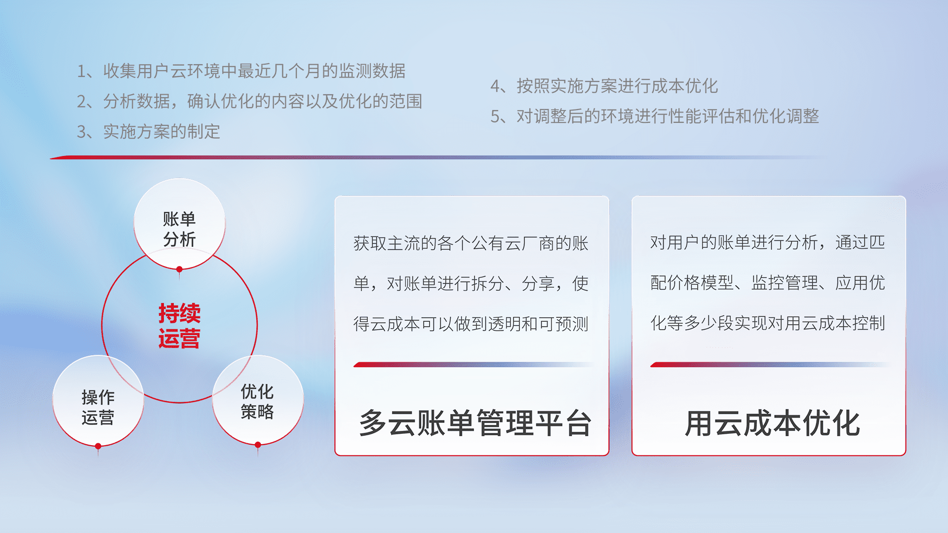 通过多云纳管,,,以统一的资源数据模型把客户的云资源进行抽象和封装,,,,进而实现对多云资源的统一操作,,,,保障云资源管理的可靠性、、稳定性与可用性。。。。量身定制化运维内容,,配置、、开发运维、、补丁管理、、、、备份、、、监控、、、认证和访问管理、、、、审计和日常巡检等,,,保障在用云过程中的可靠度,,稳定度以及高可用率。。。。