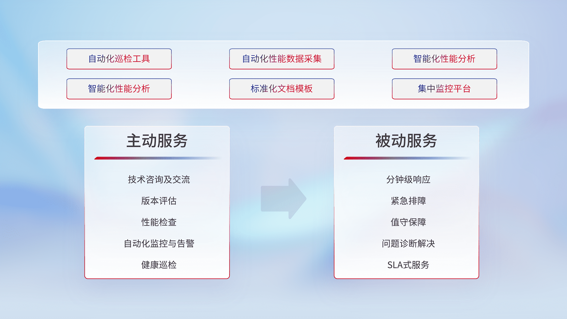 智能化工具和标准化文档,,,保障服务质量,,,提供主动服务(包含技术咨询、、、版本评估、、、性能检查、、、、自动化监控与告警、、、、健康巡检)和被动服务包含(分钟级响应、、、紧急排障、、、、值守保障、、问题诊断解决、、、、SLA服务)。。。